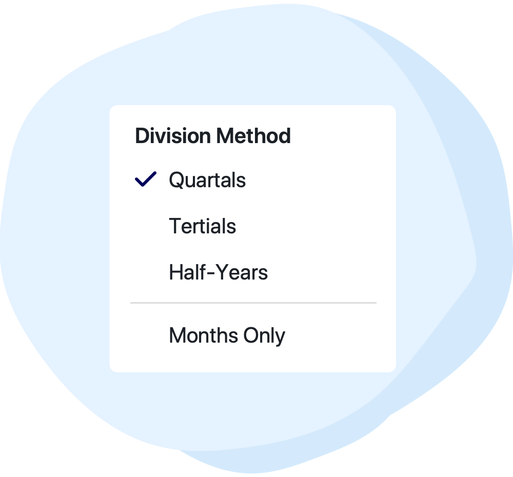Plan-365 can display the timeline one quartile, tertile, six months or one month at a time. From the Settings you can pick the default view for the entire organization. The annual view can start from any quartile you prefer.