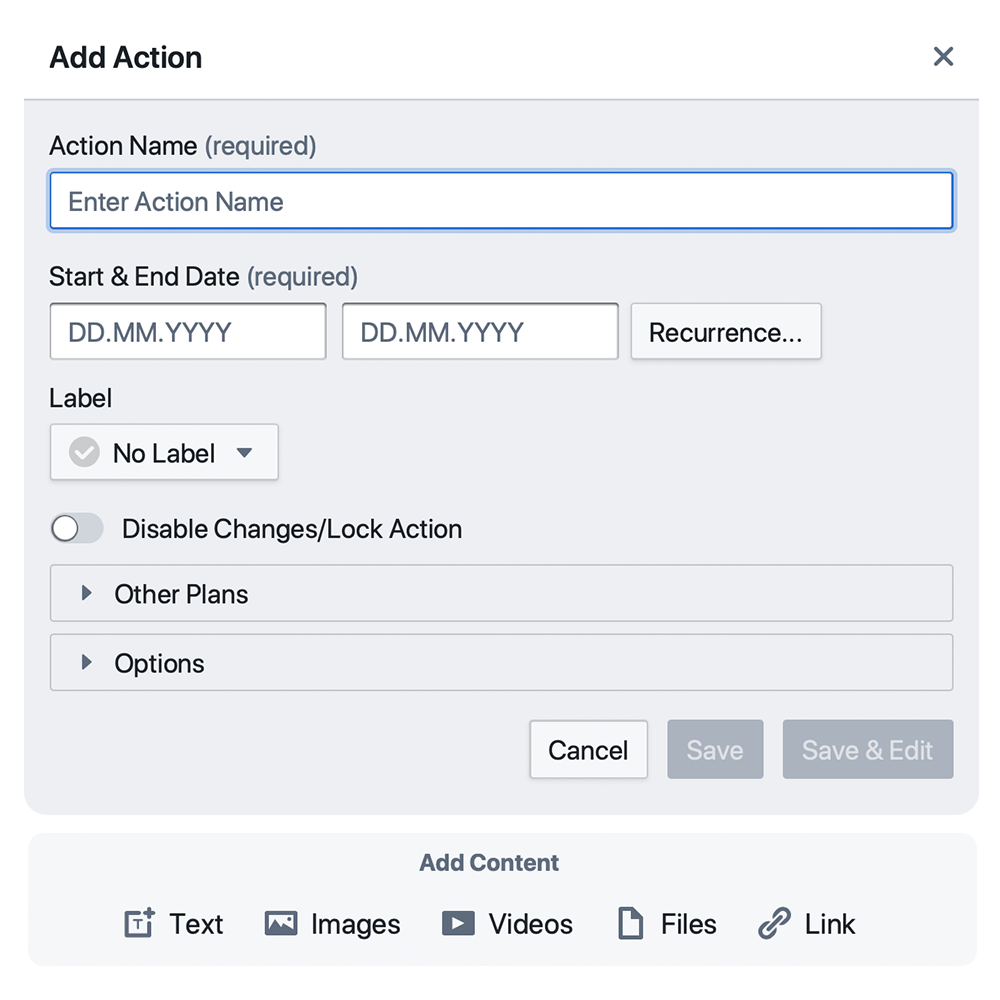 After that you can type in the details of the action. If you want to add content to it straight away, just choose Save & Edit. Then, you can edit the action, add content, or add Key Dates to it. You can also copy the action and paste it to another date.
